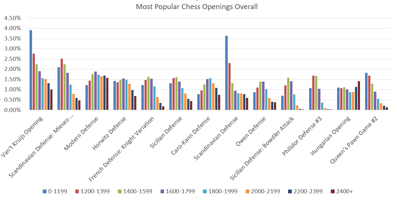 Looking at this data it is quickly obvious that Scandinavian Defense is not as popular on higher level of plays as it is among amateur players. Most of these openings lose popularity as ratings increase. Let’s have a look at what the really strong players are choosing: