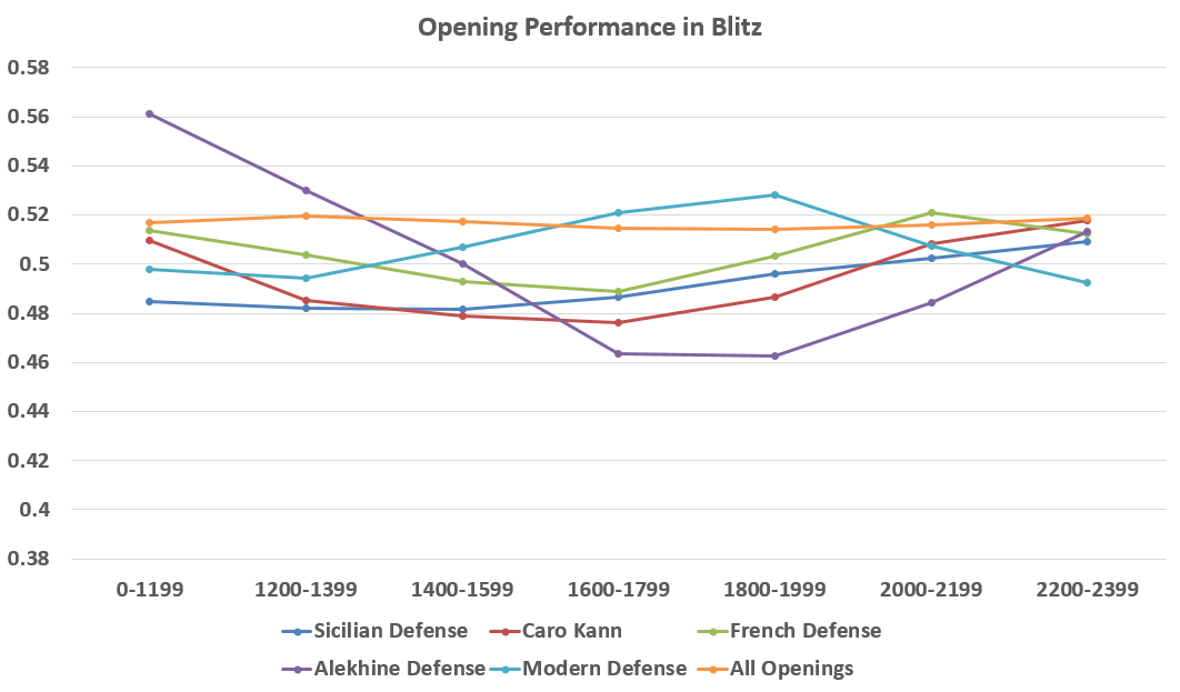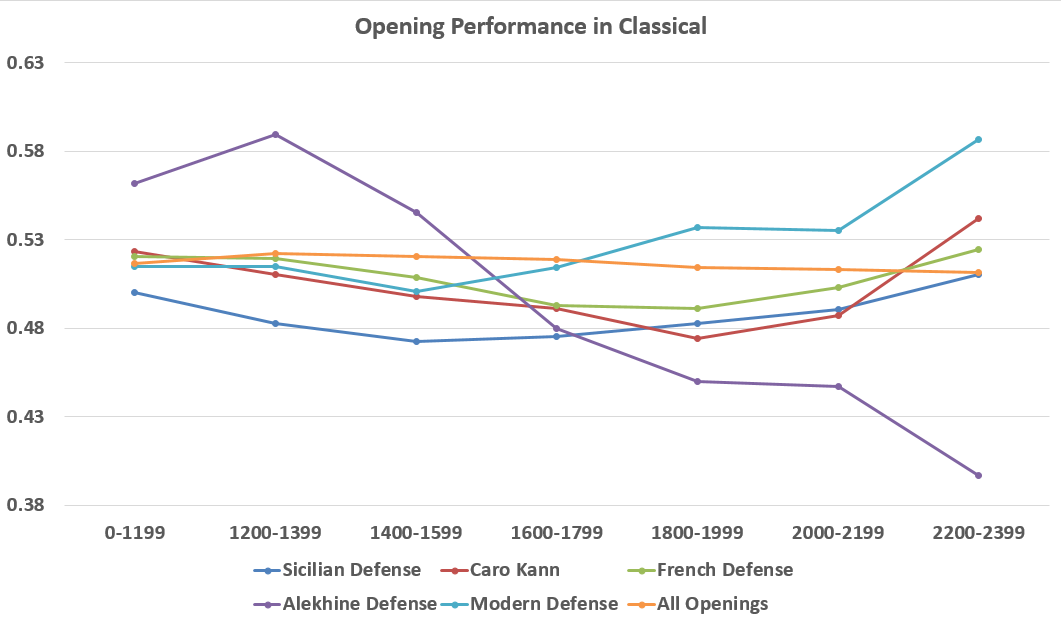 The lower on the chart, the stronger the better the opening does for black… And it seems that Alekhine Defense is an excellent choice, especially in classical games! As somewhat expected, Sicilian Defense does very well being the most popular of these choices among all chess players.