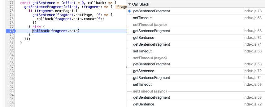 Now with the synchronous version of the recursive code, you could see the recursive invocations within the call stack (by placing a breakpoint at the termination condition). With the asynchronous version you can actually do the same: