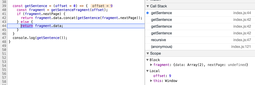 And now for the other branch, where there is another page to fetch, which is where the function is invoked recursively. Here we invoke getSentence