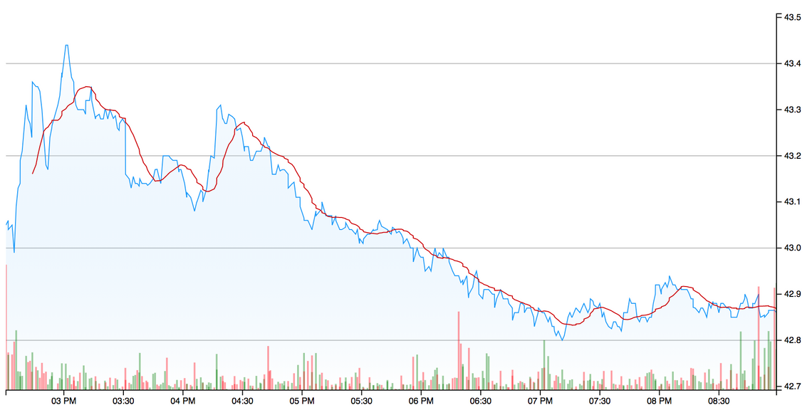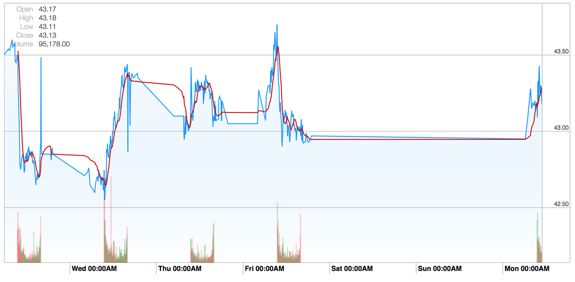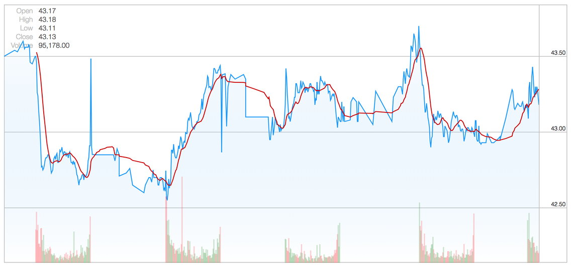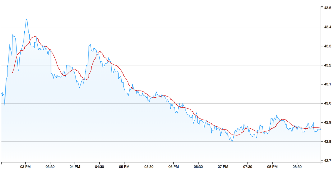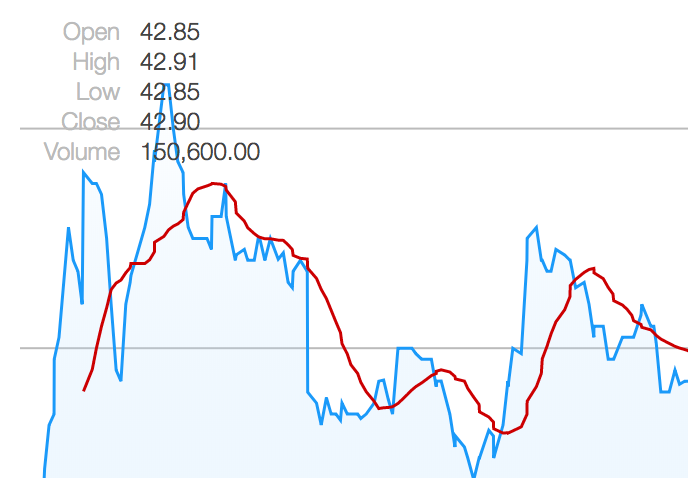The red line in the Yahoo chart is a Moving Average, which creates an average value based on the previous ‘n’ datapoints, smoothing the underlying data. d3fc has a number of financial indicator components, one of which is a simple moving average.