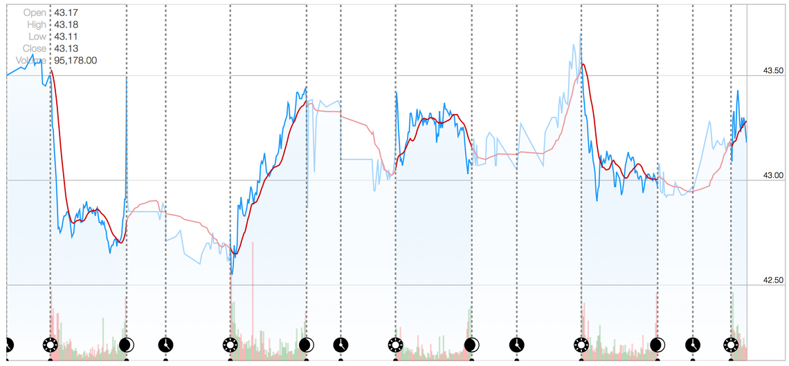 The original chart has some interesting annotations, a combination of vertical lines and bands, to make the out-of-hours trading clearer. d3fc has a number of different annotation types that can be used to render this sort of feature.
