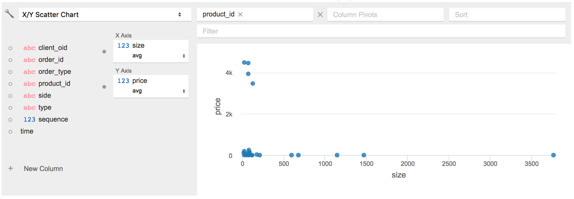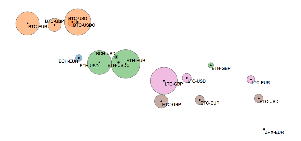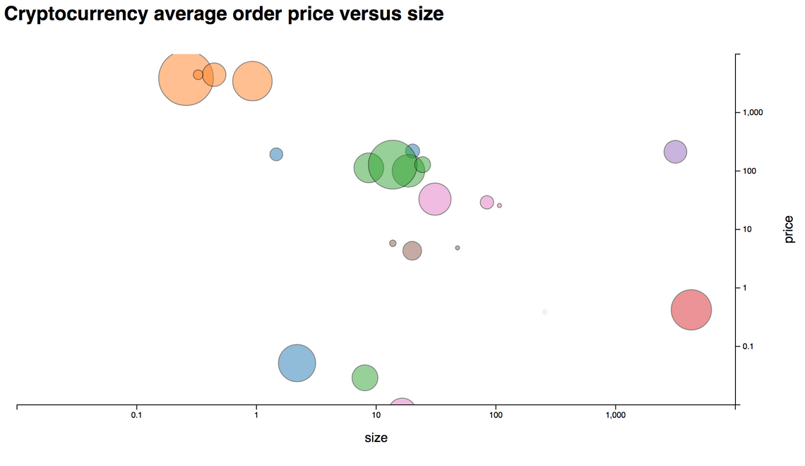 to access the computed view. It uses the d3fc point series, and chart components to create a scatter plot. Additional D3 scales are used for determining the colour of each point, from the base currency, and the size, based on the total number of orders: