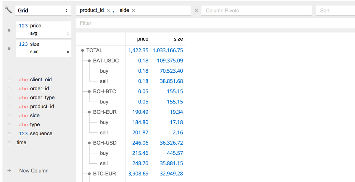 With this in place, you can see your data rendering in a grid, with various controls allowing you to group, sort and manipulate the data. Here’s an example which shows the average bid / ask price and total volume for each product: