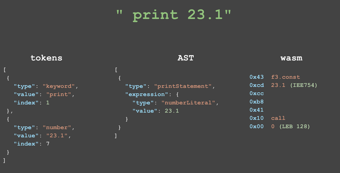 Now that you’ve seen how to dynamically create wasm modules, it’s time to turn our attention to the task of creating a compiler. We’ll start with a bit of terminology.