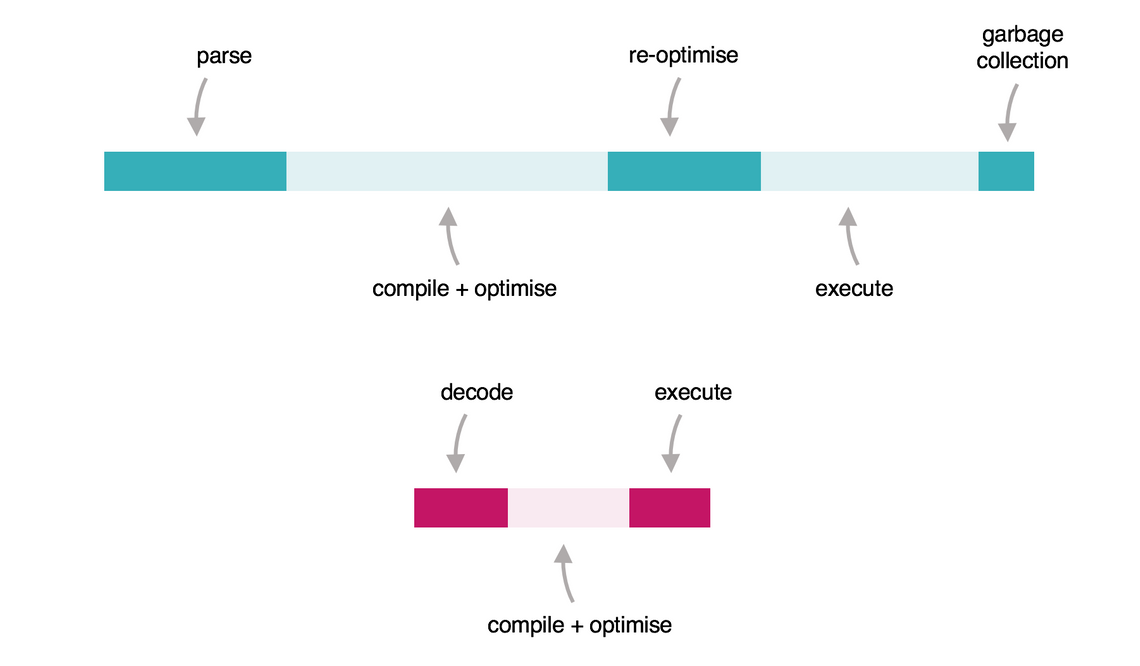 The top diagram shows a simplified timeline for the execution of some JavaScript code within the browser. From left-to-right, the code (typically delivered as a minified mess!) is parsed into an AST, initially executed in an interpreter, then progressively optimised / re-optimised until it eventually runs really quite quickly. These days JavaScript is fast - it just takes a while to get up to speed.