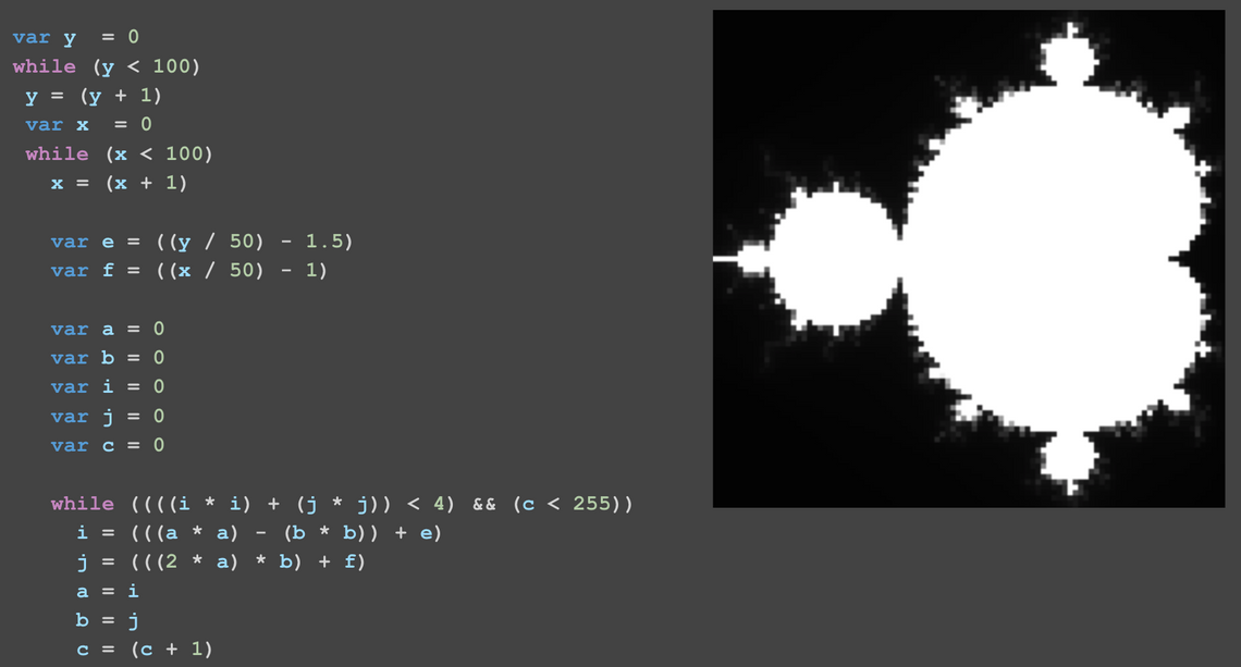 One final point, it was never my aim to create a fully-featured programming language, or one that is actually any good. My goal was to create ‘enough’ of a language to allow me to write a program that renders a mandelbrot set. This language is compiled to WebAssembly using my compiler, which is written in TypeScript and runs in the browser.