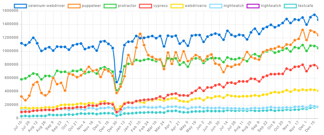 The main component needed to write browser automated checks is a browser controller: a tool that simulates user actions. There are a few Node.js frameworks capable of controlling a browser. The graph below shows the most popular ones (based on the number of downloads) in the last 18 months: