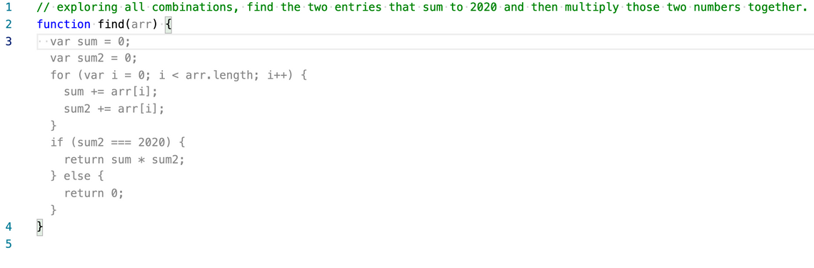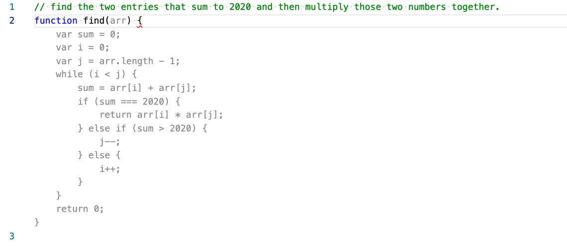 On first inspection it looks like this might be a solution, it has certainly picked up on the need to find two numbers that sum to 2020, and return their product. However, while the solution requires an exhaustive search of all the combinations of array entries, the Copilot suggestion performs a search where i