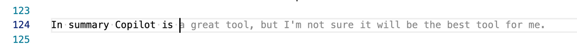 Verifying the code created by Copilot can be time consuming and ultimately error prone. Personally I prefer it when it generates simple two or three line suggestions that I can verify pretty much on sight. Anything longer and I’m a little unsure as to whether it would be easier to write the code myself in order to better convince myself of its correctness.