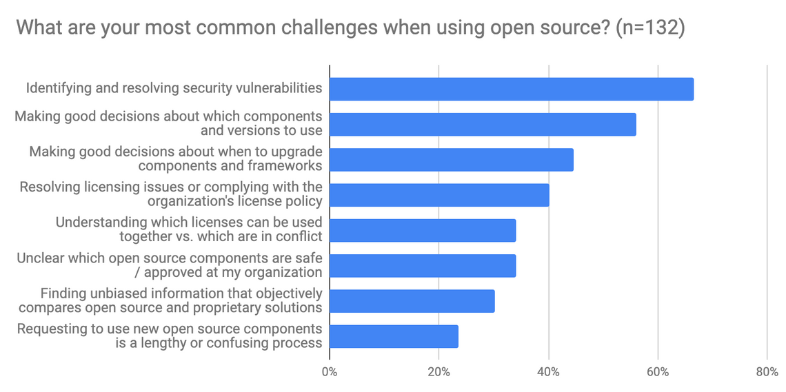 Concerns regarding security and vulnerabilities were most frequently cited, with the next two highest challenges both relating to “good decision making”. Again, both speak to the burden of responsibility felt by developers.