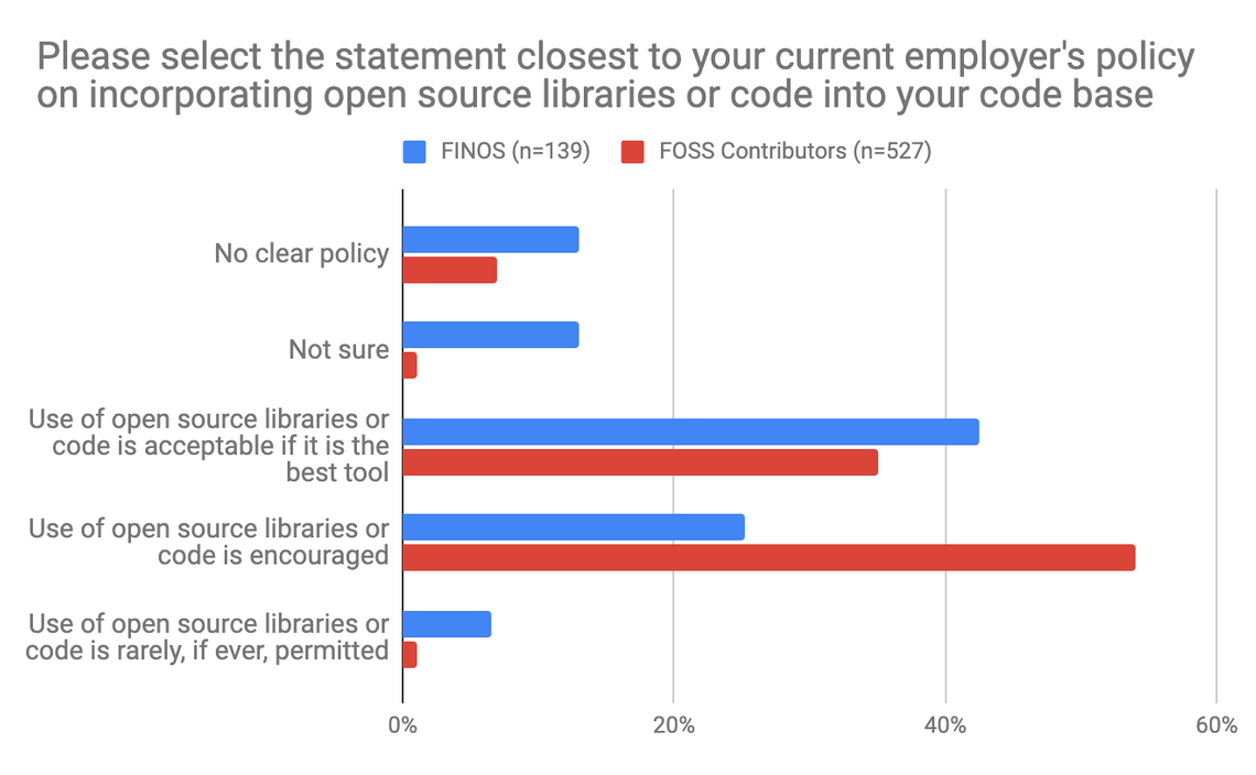 We asked respondents to describe their employer’s policy on incorporating open source libraries into their codebase (i.e. consuming):