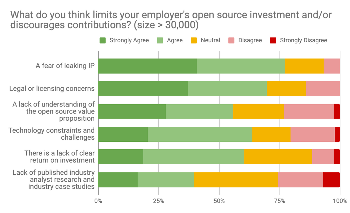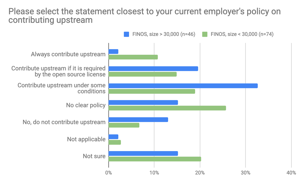 The very large organisations (30,000+ employees), which tend to be top-tier / global banks, have clearer policies, which is no doubt due to the more rigorous policy and compliance training. But they also tend to be less welcoming of upstream contribution.