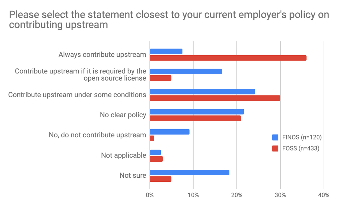 A significant number (30%) answered that there was no clear policy or that they were not sure, and for 9% their understanding of their employer’s contribution policy is that upstream contribution is prohibited.