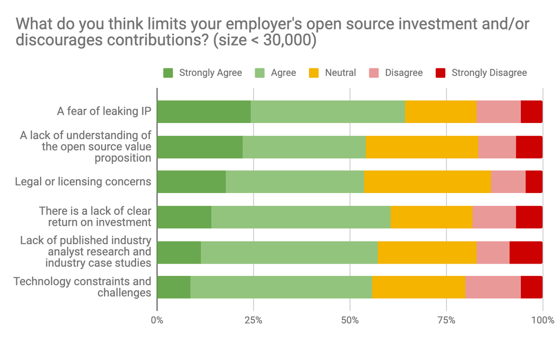 We asked respondents to describe what they feel are the factors that limit their employer’s open source investment. Again, splitting the results by company size: