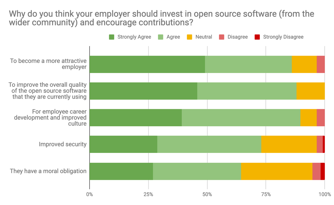 That it would help them become a more attractive employer came out on top. Circling back to the FOSS contributor survey, 65% of respondents said that their current employer’s support for open source influenced their decision. It clearly does make a difference.