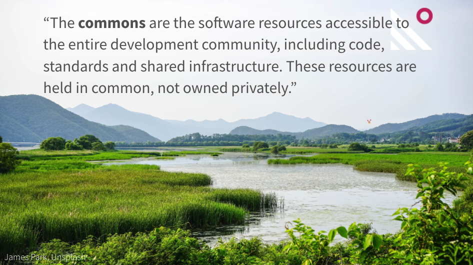 The commons are the software resources accessible to the entire development community, including code, standards and shared infrastructure. These resources are held in common, not owned privately.