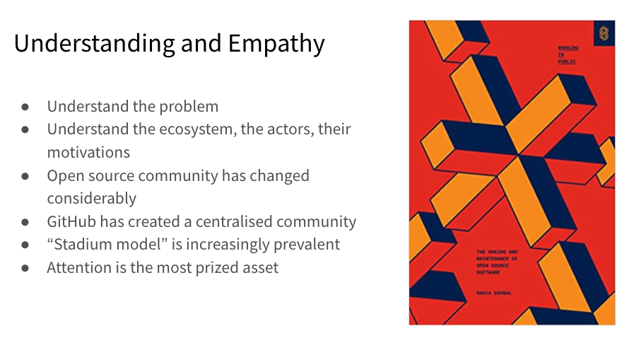 I’m not going to delve deep into this topic, instead I am going to recommend that you buy a copy of, and read “Working in Public” by Nadia Eghbal. I learnt so much from this book.