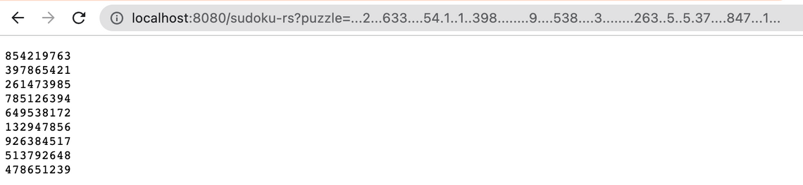 The above Rust application uses the Sudoku crate to solve a sudoku grid, with the unsolved grid provided via the puzzle